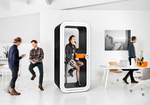 Если же для обустройства нескольких переговорных площади недостаточно, нужно продумать места для комфортной уединенной работы, видеоконференций, встреч и т. д. Для этого можно выделить локации в лаунж-зоне или установить акустические кабины с системой вентиляции, продуманным освещением и звукопоглощающими панелями внутри.