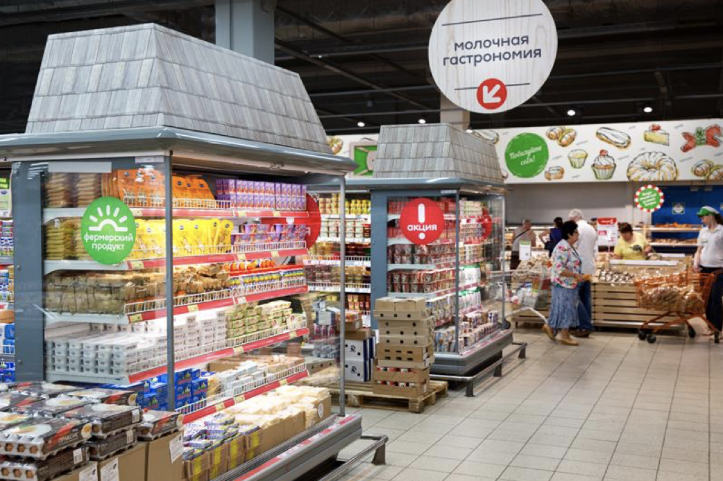 Если пространство торгового зала позволяет, лучше отказаться от использования классических стеллажей или сочетать эти конструкции с более заметными и броскими элементами. Например, торговый зал может быть заставлен холодильными камерами, объемными ларями или дисплеями с выложенным товаром. Если возможности эксклюзивного оформления нет, на помощь приходят световые короба и шелфорганайзеры.
