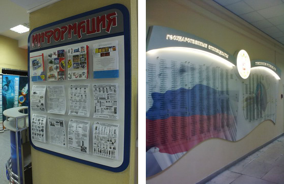 Наша компания поможет красиво оформить интерьер учебного заведения с помощью стендов, витрин, информационных досок и других конструкций, созданных индивидуально по Вашему заказу.